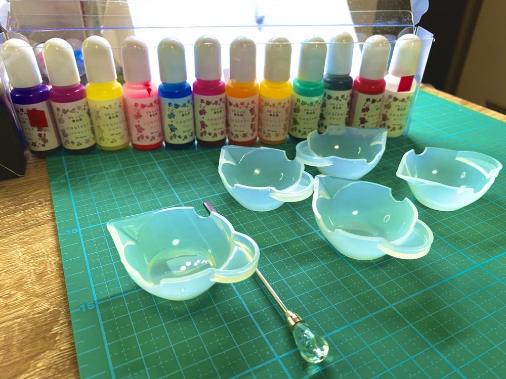 必要な材料として、レジン、硬化剤、計量カップ、混ぜるスティックなどを揃えます。